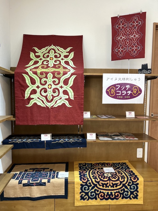 玄関には、アイヌ文様刺繍サークル・フッチコラチの商品が売られています。