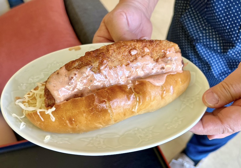 魚を食べない息子もペロリ!ホッケドッグ(550円)。ブーランジェリーニシオさんのパンに白老産のホッケフライをはさんでいます。