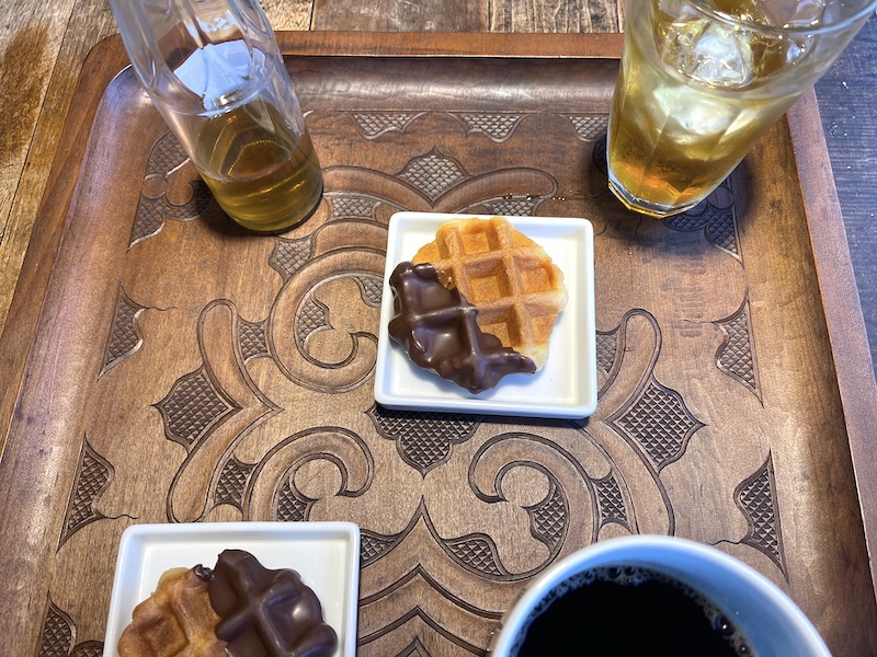 お茶を頼むと、よしこさんが、壁に飾っていたイタ(木彫りのお盆)を、さりげなく外して出してくれました。