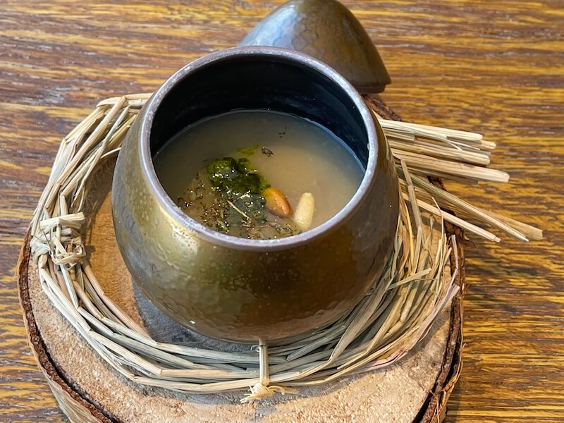 スープには、ギョウジャニンニク(プクサ)のペーストと松の実が入っています。
