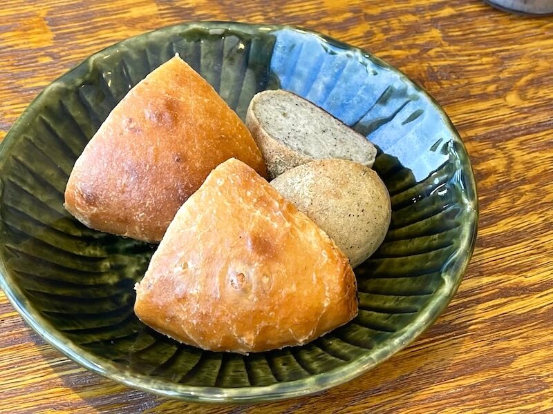左のパンが薙刀こうじゅ(セタエント)とクルミのパンです。