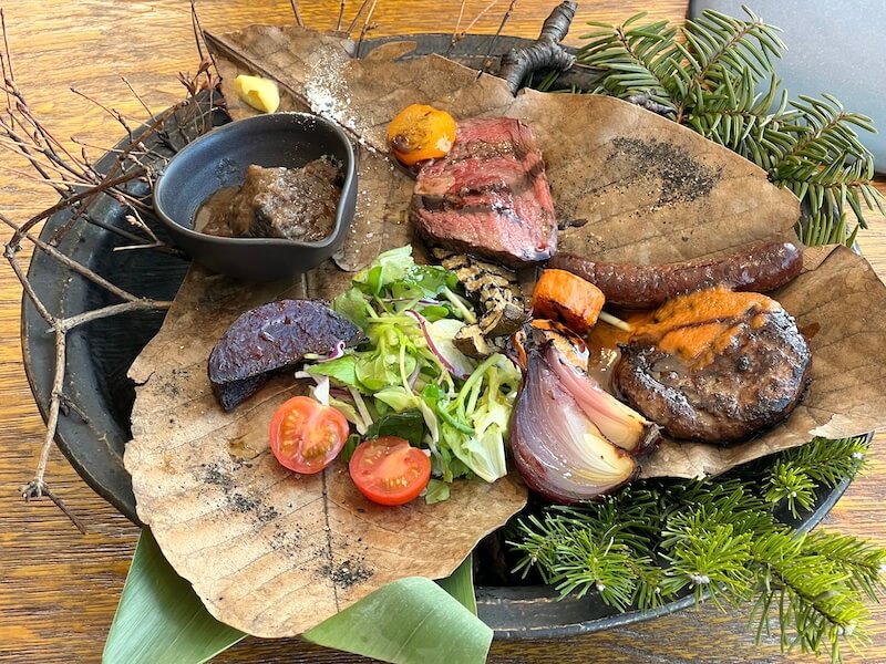こちらがメインのエゾシカ肉(ユㇰ)の焚き火ローストです。※白老牛とユㇰの合い挽きハンバーグも写っています。